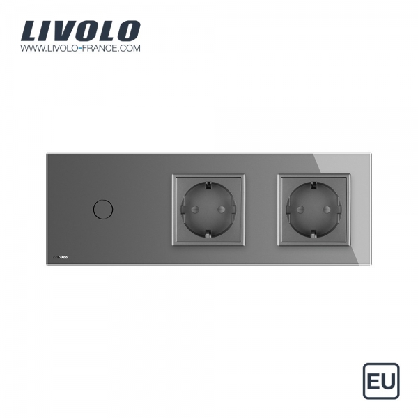 Triple combinaison : 1 interrupteur tactile 1 bouton et 2 prises de courant avec terre - Europe sur une plaque double qui permet d'allumer ou d'éteindre un éclairage par simple effleurement du doigt et d'alimenter en toute sécurité tous vos appareils domestiques.