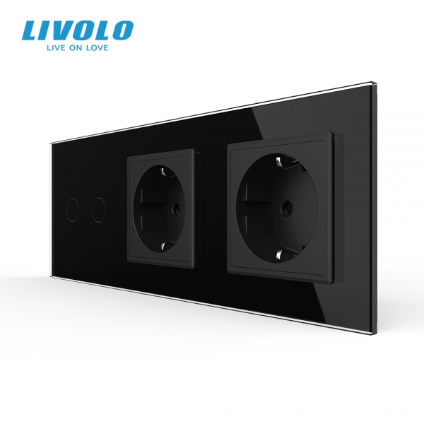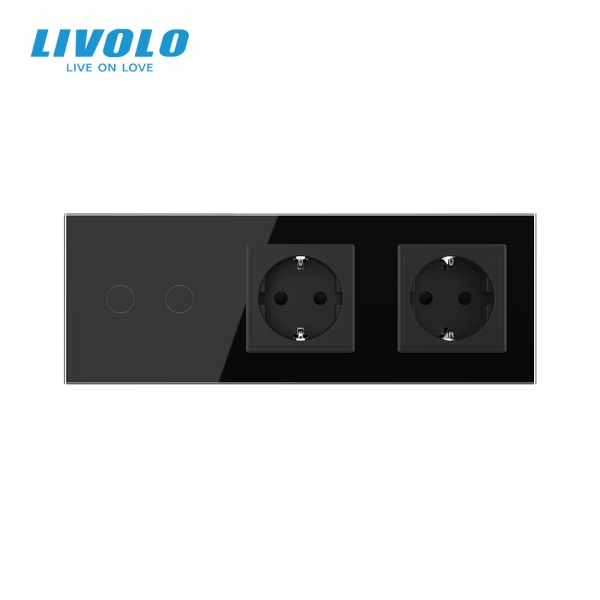 Triple combinaison : double interrupteur tactile 2 boutons et 2 prises de courant avec terre - Europe sur une plaque double qui permet d'allumer ou d'éteindre 2 éclairages par simple effleurement du doigt et d'alimenter en toute sécurité tous vos appareils domestiques.
